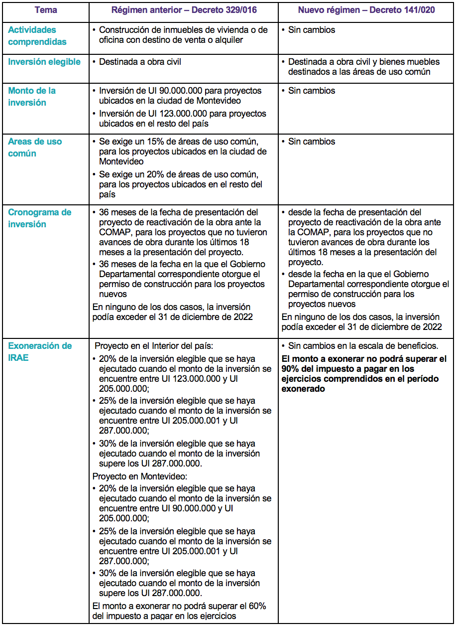 Sin embargo, a la fecha de hoy se encuentran en curso una importante cantidad de proyectos que se ampararon en el anterior régimen del Decreto 329/016, y siendo el nuevo régimen más beneficioso que el anterior, el pasado 15 de mayo Presidencia de la República emitió un nuevo Decreto, el 141/020, cuyo fin es equiparar los beneficios fiscales de ambos regímenes promocionales.