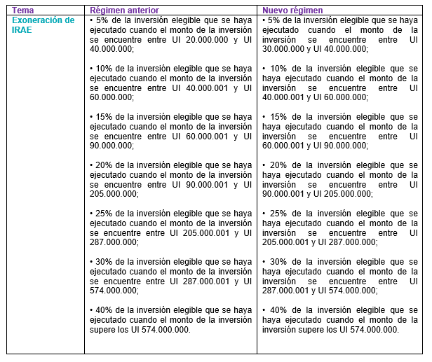 - Como consecuencia del aumento anteriormente detallado, se modificará la primera franja de exoneración de IRAE, la cual será del 5% de la inversión elegible ejecutada, para montos de inversión que se encuentren entre UI 30.000.000 y UI 40.000.000.
